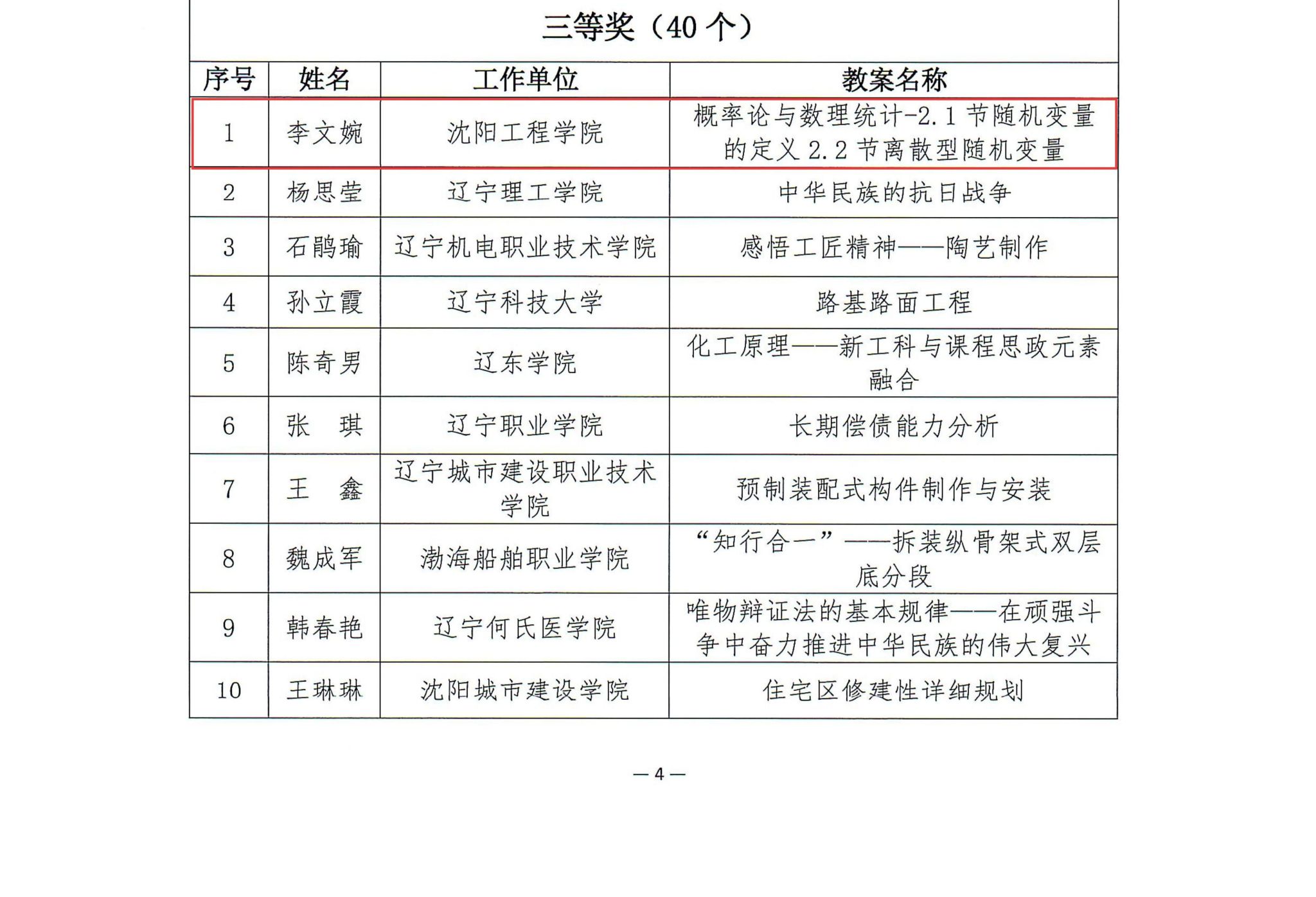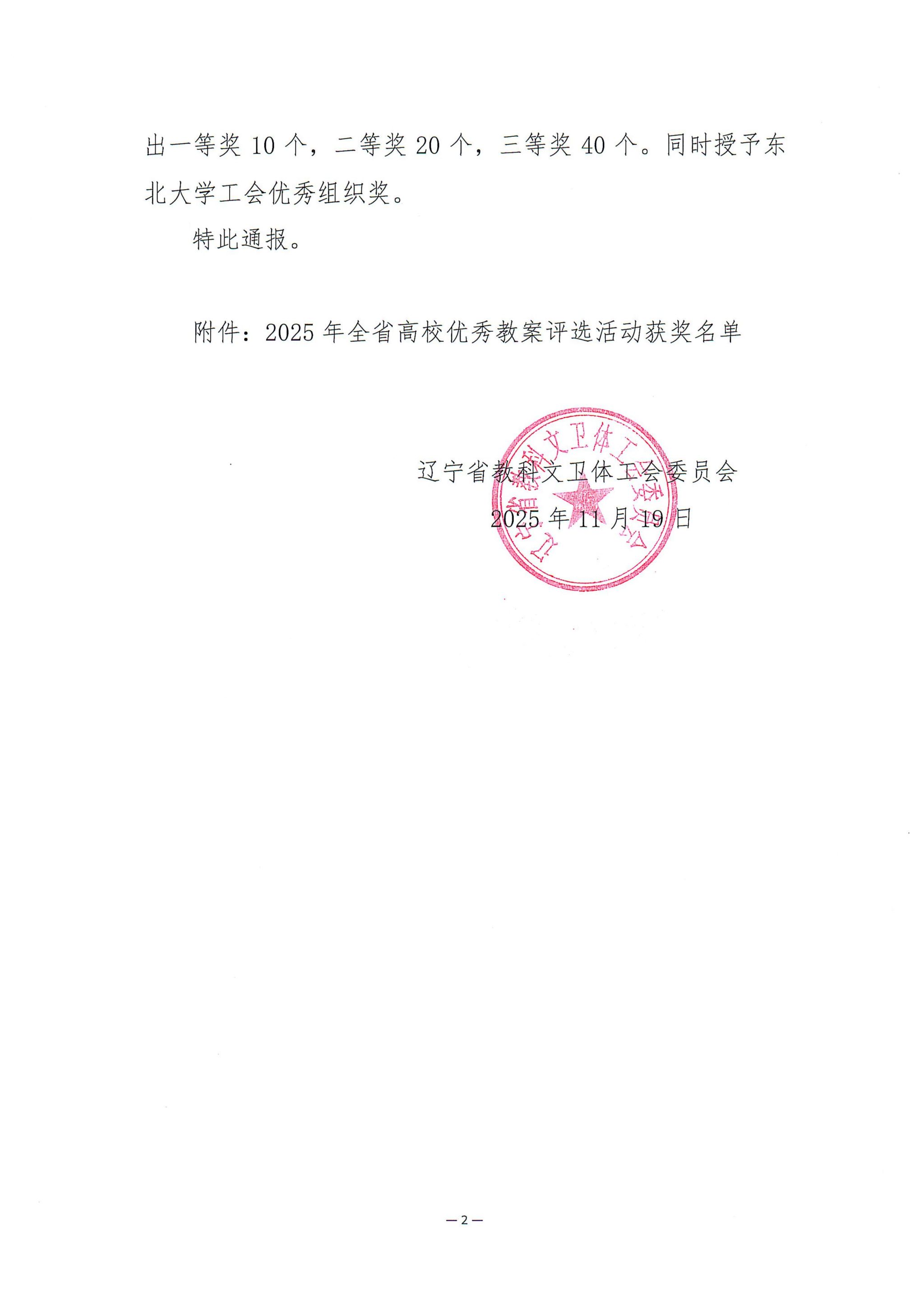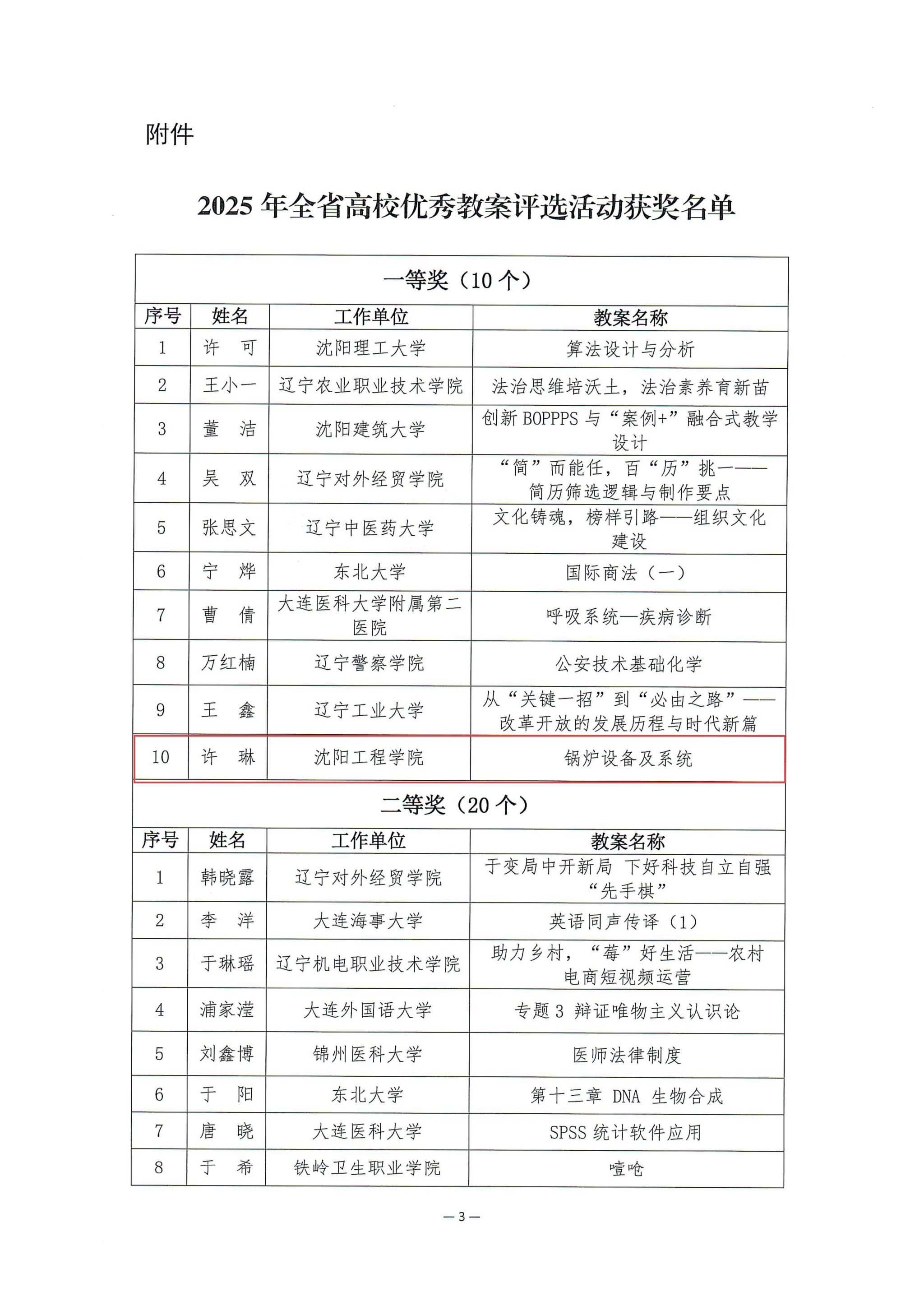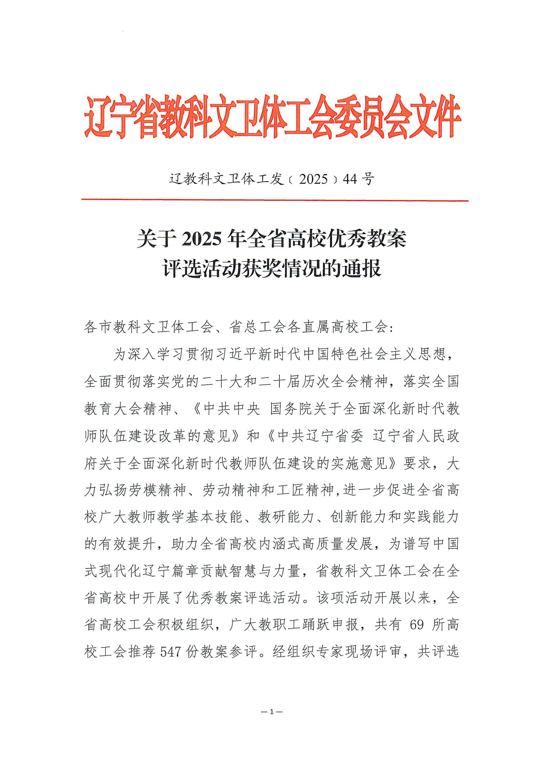 近日,辽宁省工会印发《关于 2025 年全省高校优秀教案评选活动获奖情况的通报》(辽教科文卫体工发〔2025〕44 号)。我校教师凭借深厚的教学积淀、扎实的专业功底与创新性教学设计崭露锋芒,在此次评选中斩获佳绩!其中,许琳老师的教案以精湛的教学构思与鲜明的育人特色荣获一等奖;李文婉老师的教案因突出的实用价值与独特的教学亮点获评三等奖。