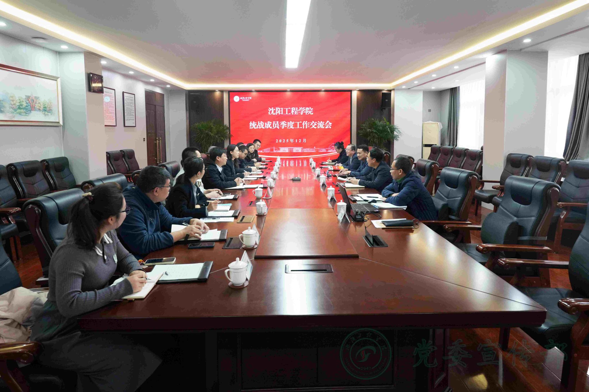 为深入学习贯彻党的二十届四中全会精神,科学制定学校“十五五”发展规划,汇聚统一战线智慧力量,助推学校事业高质量发展。12月10日下午,学校在校部319会议室召开2025年统战成员第四季度工作交流会。会议集中学习了《中国共产党第二十届中央委员会第四次全体会议公报》,针对《沈阳工程学院“十五五”发展规划(征求意见稿)》和推动学校高质量发展进行交流研讨,提出意见建议。党委书记王强出席会议并讲话。学校党政办、发展规划处负责人参加会议,发展规划处介绍了学校“十五五”发展规划编制背景、总体思路、核心目标、重点任务。学校各统战组织负责人、统战成员代表参加座谈交流。会议由党委常委、党委统战部部长戴建陆主持。